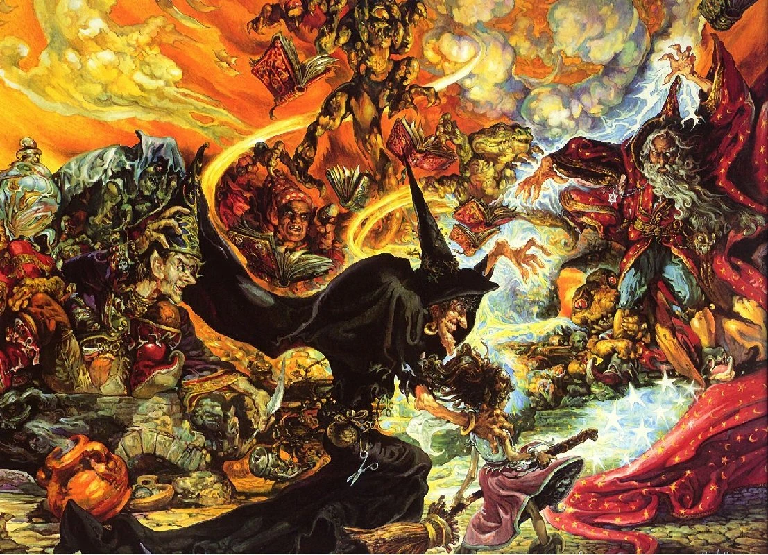 The Cover: Pratchett commented that one thing which had tickled him about Josh Kirby's artwork for the Equal Rites cover was that it subliminally reflected the Freudian overtones of the book (references to "hot dreams", the angst of adolescence, things that might be called "magic" envy)... Kirby's artwork "coincidentally" draws Esk with the broom handle where a penis would be which is a traditional interpretation of the basis of the "witches flying around on broomsticks" myth.